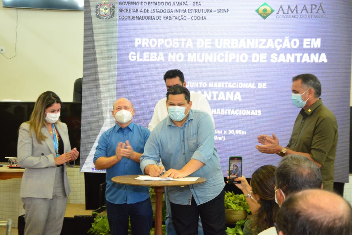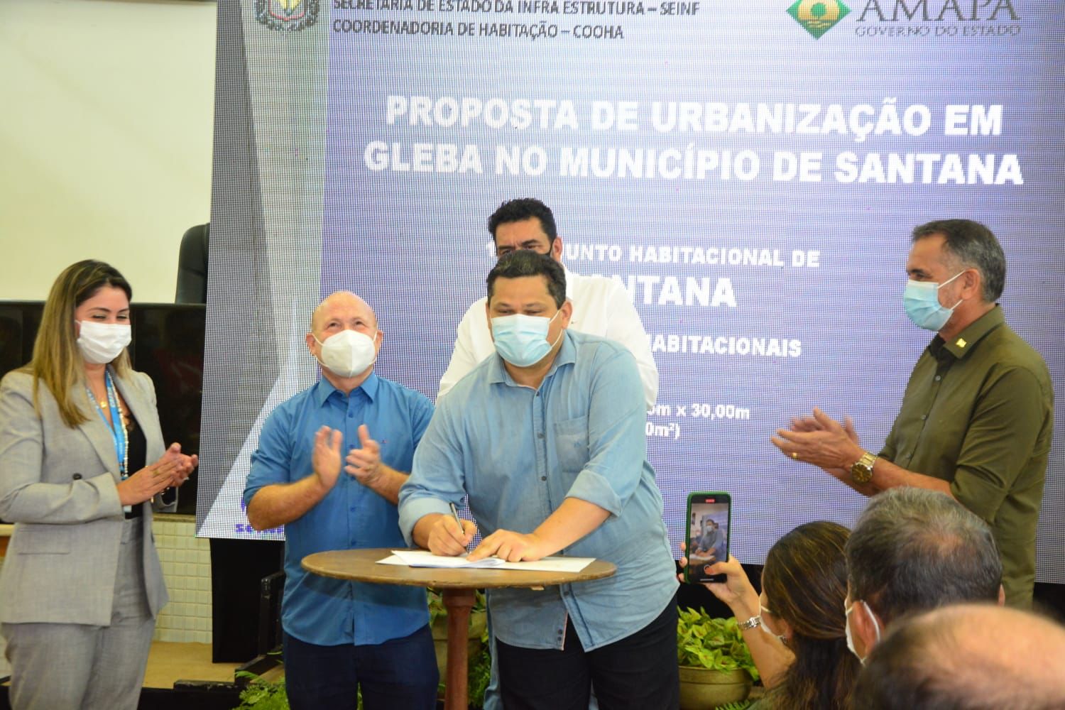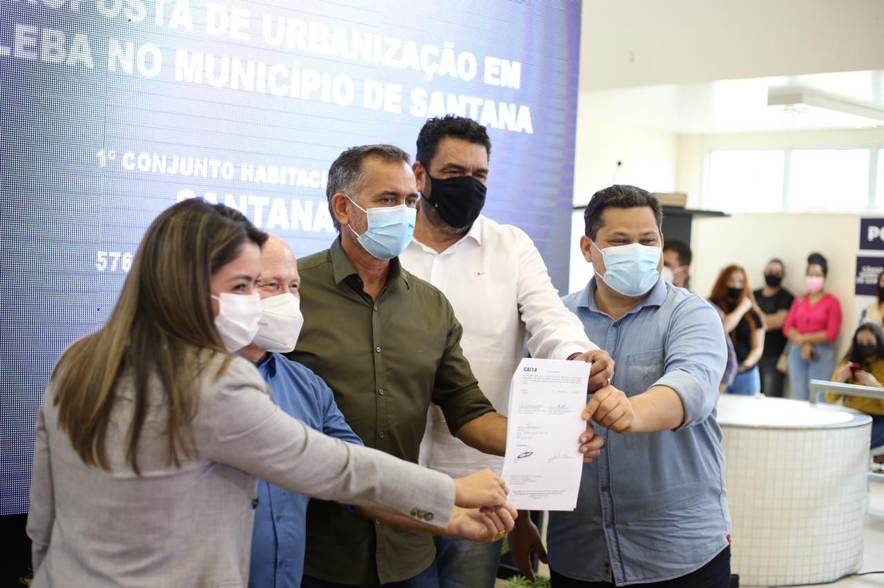 Em cerimônia na Câmara Municipal de Santana, na manhã desta terça-feira (18), com a presença do senador Davi Alcolumbre, o governador do Amapá, Waldez Goés, o prefeito de Santana, Bala Rocha e a Caixa Econômica Federal assinaram o contrato de construção do primeiro conjunto habitacional do município, que contou com a articulação do senador.