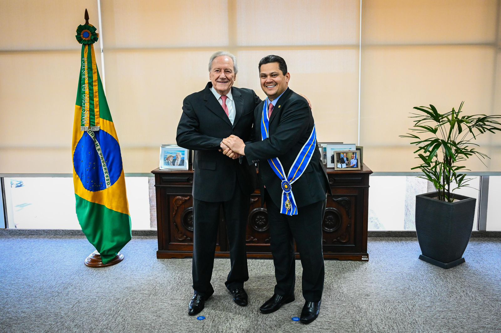 Brasília (DF) – Nesta sexta-feira (23), o presidente do Senado Federal e do Congresso Nacional, Davi Alcolumbre, foi condecorado com a Comenda da Ordem do Mérito do Ministério da Justiça e Segurança Pública, no grau Grã-Cruz, a mais alta honraria da Pasta. A medalha foi entregue pelo ministro Ricardo Lewandowski, em cerimônia realizada no Palácio da Justiça, em reconhecimento aos serviços prestados pelo parlamentar ao Estado brasileiro e à agenda institucional do país.